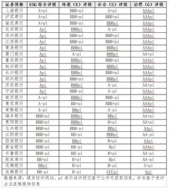根据绿发信评网站数据,中国财富网关注到,区域性银行评级结果分化特征明显。上海银行、沪农商行、渝农商行获得最高的A+pi评级,张家港行、无锡银行和成都银行级别较低,分别为BB+pi、BBpi和BB-pi。大部分银行级别分布在Api至BBB-pi,其中,北京银行、苏州银行、江苏银行、青岛银行、厦门银行、重庆银行、杭州银行、长沙银行、郑州银行、苏农银行和宁波银行级别为Api;南京银行、青农商行和常熟银行级别为A-pi;瑞丰银行、贵阳银行、兰州银行和江阴银行级别为BBB+pi;西安银行、紫金银行和齐鲁银行级别为BBB-pi。整体来看,区域性银行在治理(G)维度表现较为突出,而在环境(E)与社会(S)维度普遍存在提升空间。